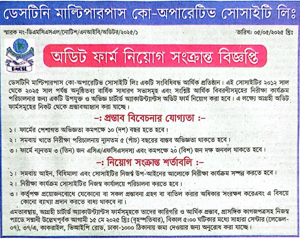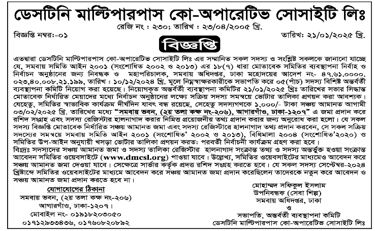 স্বপ্ন, সংকল্প, এবং সহমর্মিতার শক্তিতে গড়া ডেসটিনি মাল্টিপারপাস কো-অপারেটিভ সোসাইটি লিঃ (DMCSL) আপনাদের সকল সদস্য ও শুভানুধ্যায়ীদের আন্তরিক স্বাগতম জানাচ্ছে। এই ওয়েবসাইট আমাদের আধুনিক কার্যক্রম, স্বচ্ছতা, এবং সদস্যদের সঙ্গে ডিজিটাল সংযোগের একটি কেন্দ্রবিন্দু। এই প্ল্যাটফর্মটি আপনাদের জন্য বিশেষভাবে তৈরি, যাতে ডি.এম.সি.এস.এল সংক্রান্ত যেকোনো তথ্য সহজেই পেতে পারেন।